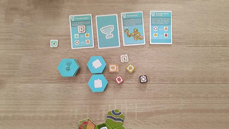 Bevor es mit dem Spiel losgehen kann, müssen zunächst ein paar Vorbereitungen getroffen werden. Je nachdem, wie weit man auf der Highscore-Leiste bereits emporgestiegen ist, werden unterschiedlich viele Sonderplättchen und Zielkarten unter die insgesamt 57 Landschafts- und 15 Auftragsplättchen gemischt. Spielt man bei der ersten Partie nur mit einem Sonderplättchen und keiner Zielkarte, sind es nach dem Erklimmen der insgesamt 16 Stufen schließlich 11 Sonderplättchen und 5 Zielkarten, mit denen es dann daran geht, die 180er Punktemarke zu knacken, um den Umschlag mit zusätzlichem Material öffnen zu dürfen.