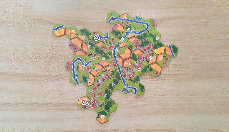 Beim Anlegen der Landschaftsplättchen, bei denen es sich wie auch bei den Auftragsplättchen um kleine Sechsecke handelt, gibt es nur zwei Regeln zu beachten: Die Plättchen müssen immer Kante an Kante angelegt werden und Flüsse müssen mit einem passenden Flussplättchen fortgesetzt werden. Ob ein Getreide an ein Dorf grenzt oder ein Wald an eine Wiese ist erstmal egal und spielt nur beim Erfüllen von Aufträgen eine Rolle.